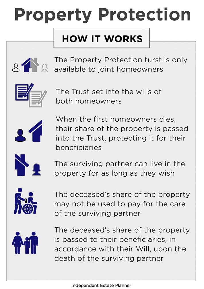 - A Property Protection Trust is an affordable and easy way to protect your share of your home’s value. For example, when you die, your home’s value could be used to fund care costs for your partner, meaning less or no inheritance to pass on to your loved ones.